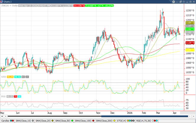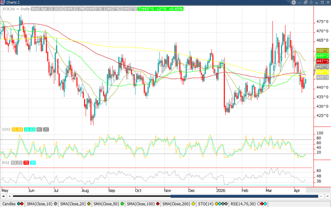 Corn – The corn market showed solid gains both on Monday and Tuesday’s sessions before backing off a bit. On Tuesday, May corn closed up 2 ¾ at $4.43. This was 3 off the high and 2 ¾ off the low. Corn export inspections were above expectations at 1.782 mmt. This was less than a week ago but stilla big number. Shipments of corn are running over 34% ahead of last year while the USDA is forecasting around a 15% increase. While many are wondering why the corn market isn’t rallying with so many planters sitting, it’s a bit early for that. With 5% of the crop planted, it’s actually 1% ahead of the 5-year average. Where it will get interesting is if we get into May and start running behind a normal pace by any degree. The trade knows we can get this crop in the ground quickly, but with cold and wet conditions the farther north you go, I assume if this pattern holds, we’ll see some risk-premium come back in. For now, I like the fact that we’re above $4.70 after a lethargic last few sessions. It’s still better than many thought we’d see this marketing year, so it warrants attention if a grower can make these prices work. Dec26 corn settled ½ lower at $4.70 ½.