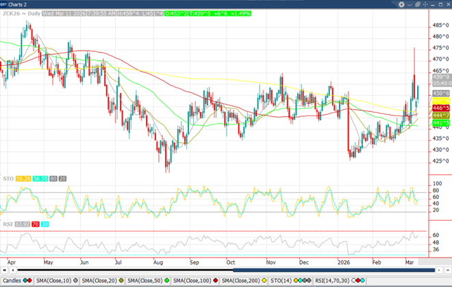 The markets were up strong on the overnight market Sunday night as the war situation in Iran hadn’t cooled a bit. With oil surging initially but backing off significantly, we saw our markets perform in a similar fashion. Beans made back Monday’s losses on Tuesday while corn stayed in the red. While President Trump has indicated the war is close to over, the markets seem unconvinced as these situations aren’t sorted out too quickly. Outside markets should have provided a negative bias as crude continued to retreat: