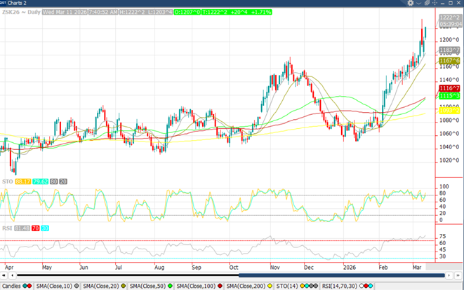 Soybeans – Soybeans also raced higher on Sunday night, betting up to $12.33 ¾ before backing off. On Tuesday, May beans were up 5 ½ at $12.01 ¾. This was 5 ¾ off the high and 24 off the low. May soybean meal was up 1 at 314.5, while soy oil was down .48 at 65.62. The weekly inspections showed bean shipments at 879 kmt, which was above expectations but well under the numbers posted a week ago. For beans, the report was similar in that the ending stocks were the same with minor revisions to the balance sheet. The same logic applies for beans to some degree as we see with regards to corn. It’s tough for me to ignore these rallies. I’d continue to reward in increments on old crop and on new, if you can call it a profit, it makes sense to continue hedging off some risk. IF and when this war subsides, I’ve got to think we’ll potentially lose a good bit of what we’ve gained. On Tuesday, Nov26 beans closed 5 ¼ higher at $11.53 ½.