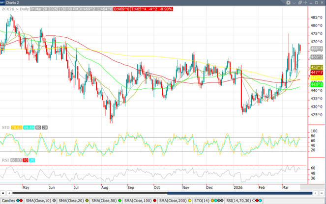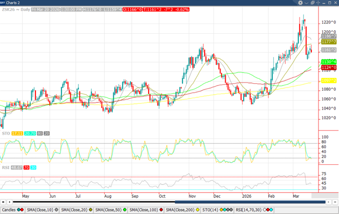 May ‘26 corn ended the week with small losses after significant pressure to start the week. May settled at $4.65 ½, down 4 ¼. This was 3 ¾ off the high and 1 ½ off the low. May lost 1 ¾ cents for the week. Technically, this market took a hit on Monday but recuperated nicely as traders seemed committed to a longer-bias. While plenty of corn is available due to a huge 2025 crop, the board continues to be well-supported as demand remains strong. The commitment-of-traders report showed another week of fund buying with 32k contracts bought, taking the funds to a net long of 231k contracts. This corn market is likely to follow energy prices-which makes it really tough to predict. No one knows how long or intense this situation might be with Iran, and with the Strait of Hormuz still closed, there is plenty of risk premium built into energy markets. Could crude rally significantly from here? Of course, and if it does, it should support corn prices. However, when the market feels comfortable the situation will start returning to normal, the wind could certainly come out of the sails. Overall, this situation warrants flexibility in our marketing plans, both for old and new-crop. Let us know if we can be of assistance in managing this volatile situation.