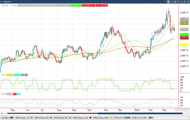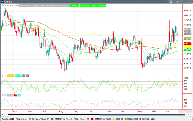 The corn market started the week losing some ground, then tried to claw back on Tuesday. May corn closed up 3 at $4.62 ½. This was 3 ¼ off the high and 3 ½ off the low. Corn export inspections were above expectations at 1.700 mmt. This was more than a week ago and a shade under expectations. These corn shipments are still running about 40% ahead of last year’s pace, while the USDA is forecasting a 14% increase. So, we’re definitely running well ahead of the pace needed to meet the USDA goal. Corn demand has no doubt been excellent, and hopefully, we’ll see a decline at a strong level on the quarterly stocks report next Tuesday. The other part of the report is, of course, the acreage-our official estimate at AgMarket is 94.4. Given how strong acreage was a year ago, our expectation is for big corn acres, but for them to be a bit lower than what we saw last year. With a historic difference in acres of 18 million, our group expects that gap to narrow. Regardless, expect major volatility when those numbers get released. December 2026 corn settled 2 ½ higher at $4.89.