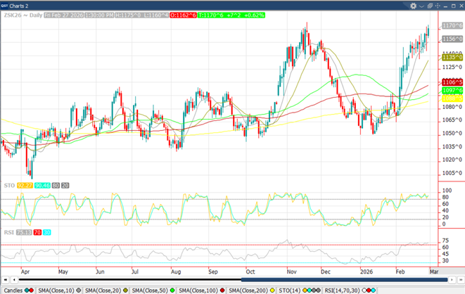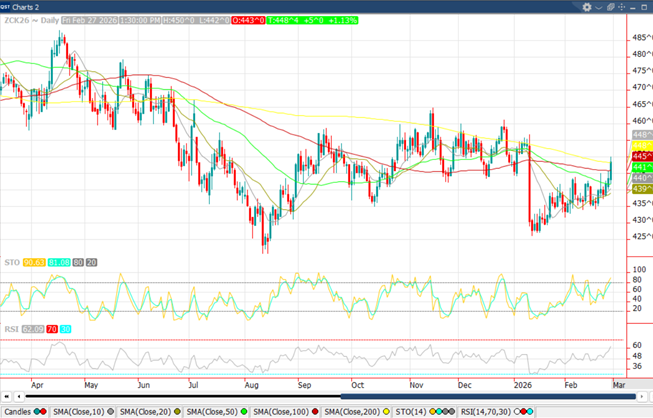 March 2026 corn, which has gone into delivery, rallied into the weekend. March settled at $4.38 ¾, up 5 ½. This was 1 ¼ off the high and 6 ¾ off the low. March rallied 11 ¼ cents for the week. May corn closed at $4.48 ½, up a nickel on Friday. Technically, we continue to build momentum at higher prices than we’ve seen in a while. Demand has been stellar, to say the least. With world and U.S. demand so strong, the need for big production is a necessity. With the wheat market rallying on weather issues in the U.S. and possibly some war premium as the U.S./Iran situation is tenuous, some of that enthusiasm has spilled over to corn. In all honesty, given demand, corn doesn’t need much of a nudge. As we move forward, rallies likely are paired with some basis weakness, while new crop should stay well supported until we get a better idea of 2026 corn acres and how this Safrinha and Argentine corn crops perform.